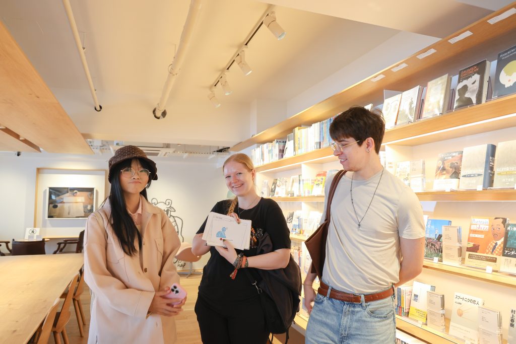 芸術的な建築と静かな空間に心を奪われ、学生たちは言葉少なに本棚を眺めていました。